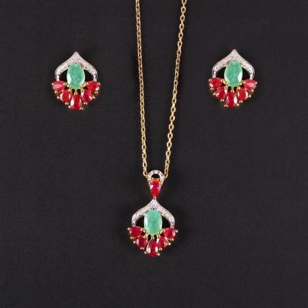 Diamond Earrings-Pendant Set with Ruby & Emerald in Gold Plated 925 Silver