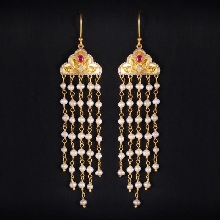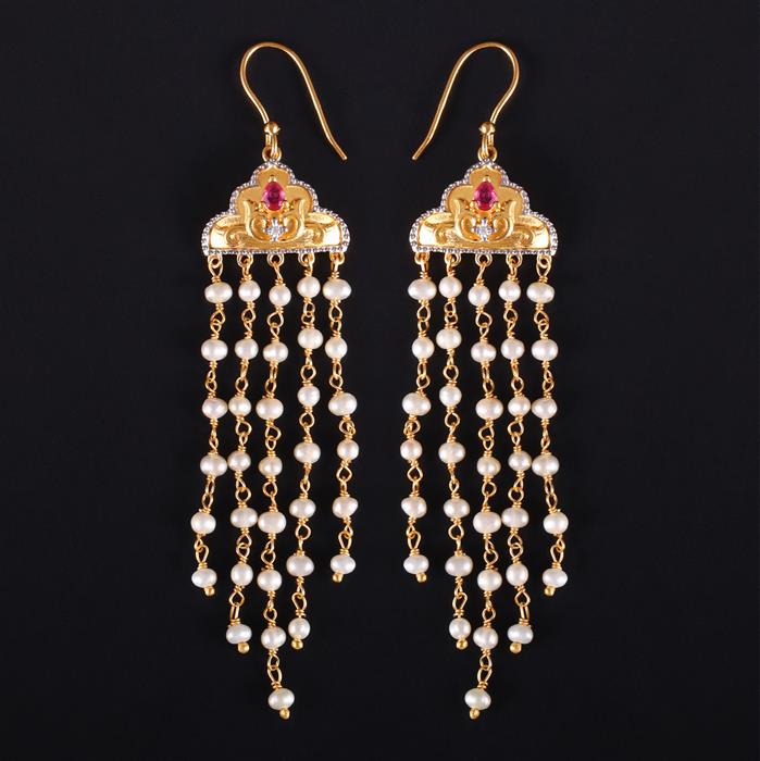 Diamond Earrings with Ruby & Cultured Pearl in Gold Plated Sterling Silver