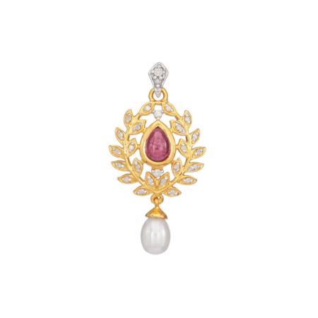 Diamond Pendant with Cultured Pearl & Thai Ruby in Gold Plated Sterling Silver.
