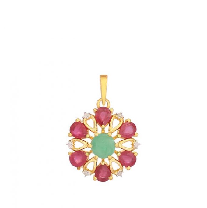 Diamond Pendant with Emerald & Ruby in Gold Plated Sterling Silver