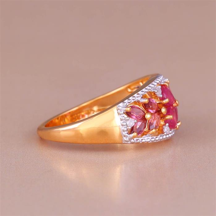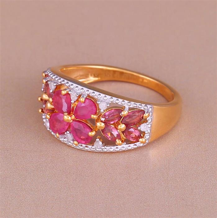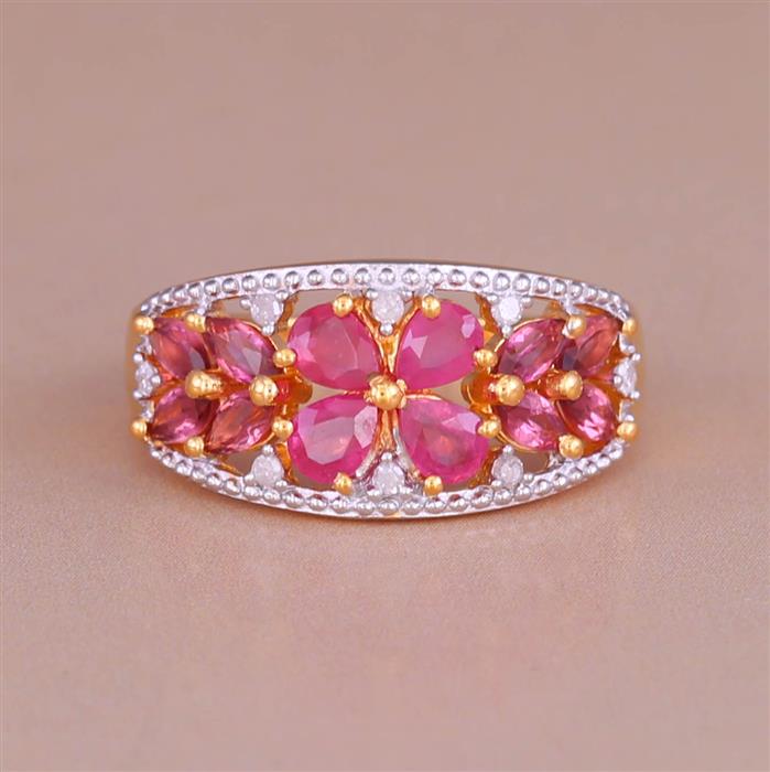 Diamond Ring with Ruby & Rhodolite in Gold Plated Sterling Silver