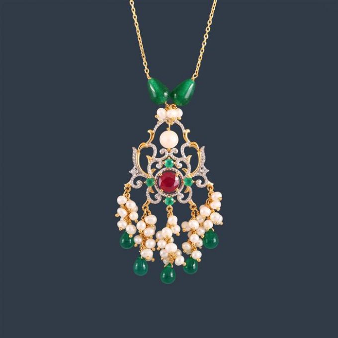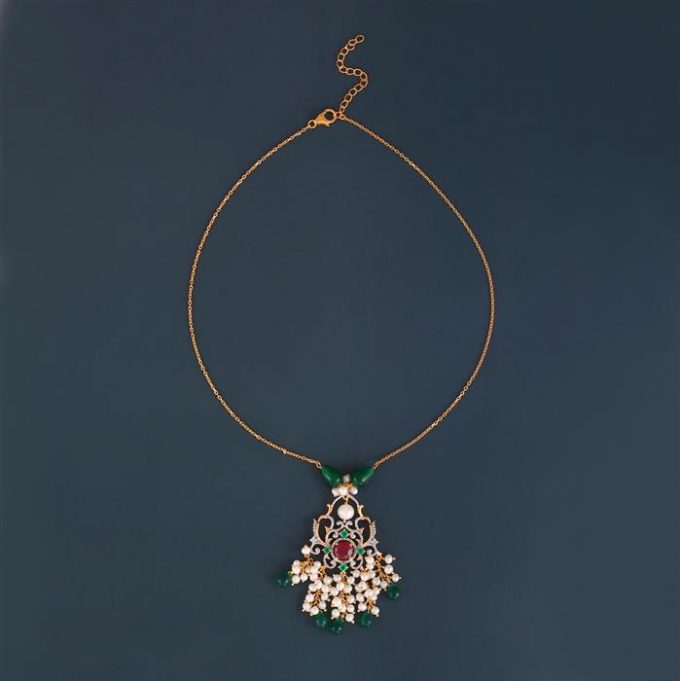 Rajwada Necklace with Diamonds, Ruby & Green Onyx in G.P. 925 Silver