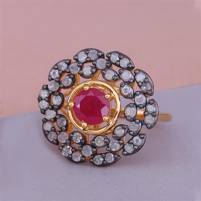Victorian Ring with Ruby & 0.85 Ct. Diamonds in Gold Plated Sterling Silver
